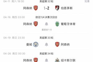 体育资讯04月11日讯 阿森纳1-2不敌伯恩茅斯,在多赛2场的情况下领先曼城9分!