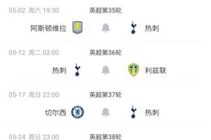 在剩余的最后6轮比赛中,热刺三个主场三个客场,将客场对阵维拉、切尔西,最后一轮主场对阵埃弗顿。