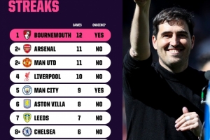 体育资讯4月16日讯 据Opta统计,伯恩茅斯是本赛季英超连续不败场次最多的球队。