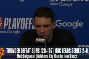 体育资讯4月23日讯 今日NBA西部季后赛首轮G2,雷霆120-107拿下太阳,大比分2-0领先。赛后戴格诺特接受了媒体采访,以下为采访全文。