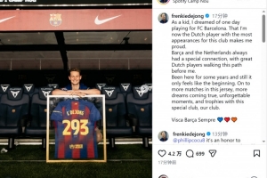 德容社媒:很自豪成为巴萨出场最多的荷兰球员,感觉这只是开始