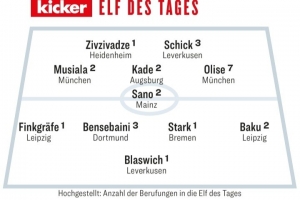 体育资讯4月27日讯 德国媒体《踢球者》评出了德甲第31轮最佳阵容,奥利塞、穆西亚拉、希克在列。