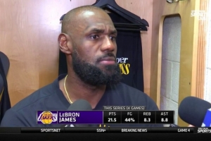 体育资讯4月27日讯 今日,湖人96-115客场不敌火箭,系列赛3-1领先。赛后,湖人球星詹姆斯接受了采访。